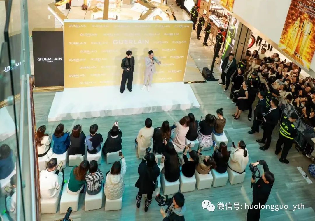 通过前期太原店微信、微博、小红书等平台宣传而来的郭俊辰粉丝,,,,,,,早早持鲜花、海报将阛阓一层大中空围住。。。。。。。